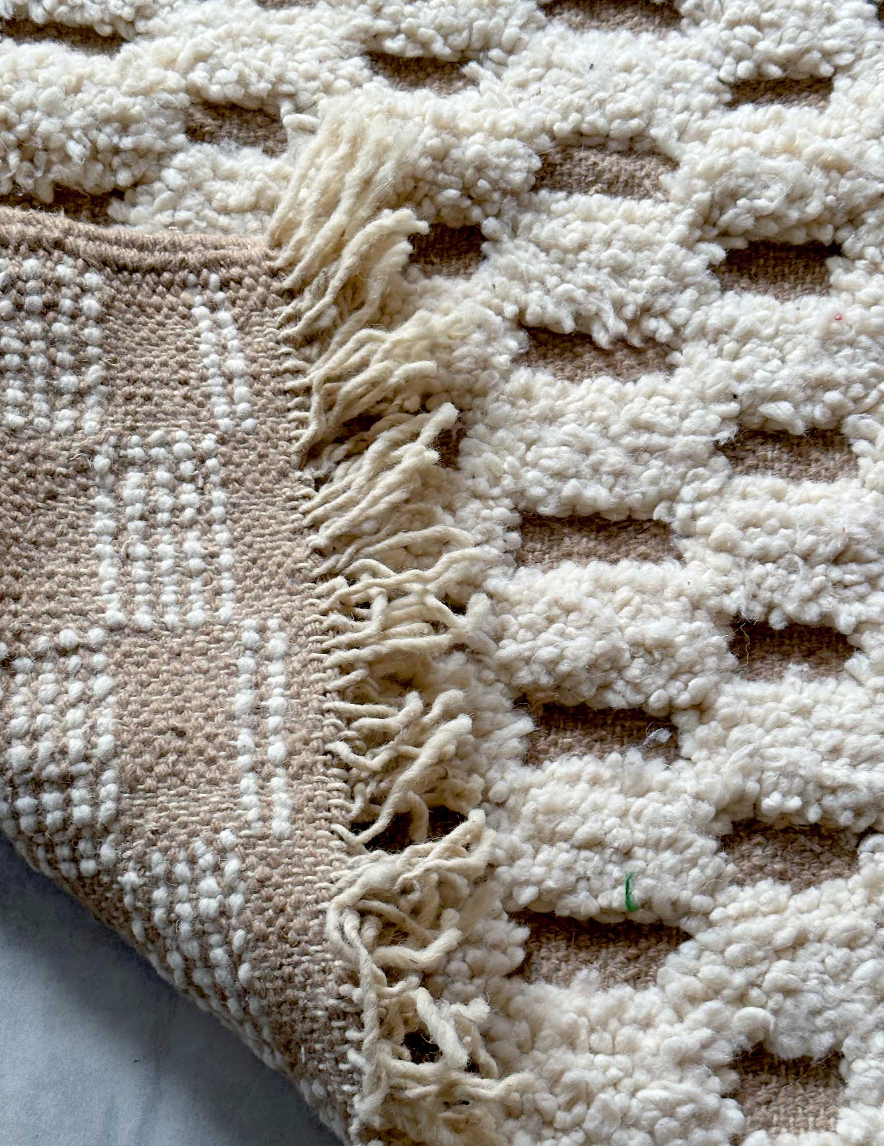 ブロックチェックのウールラグはモロッコのアトラス山脈に古くから住むベルベル人女性により伝統的な手法を古くから受けぎ、