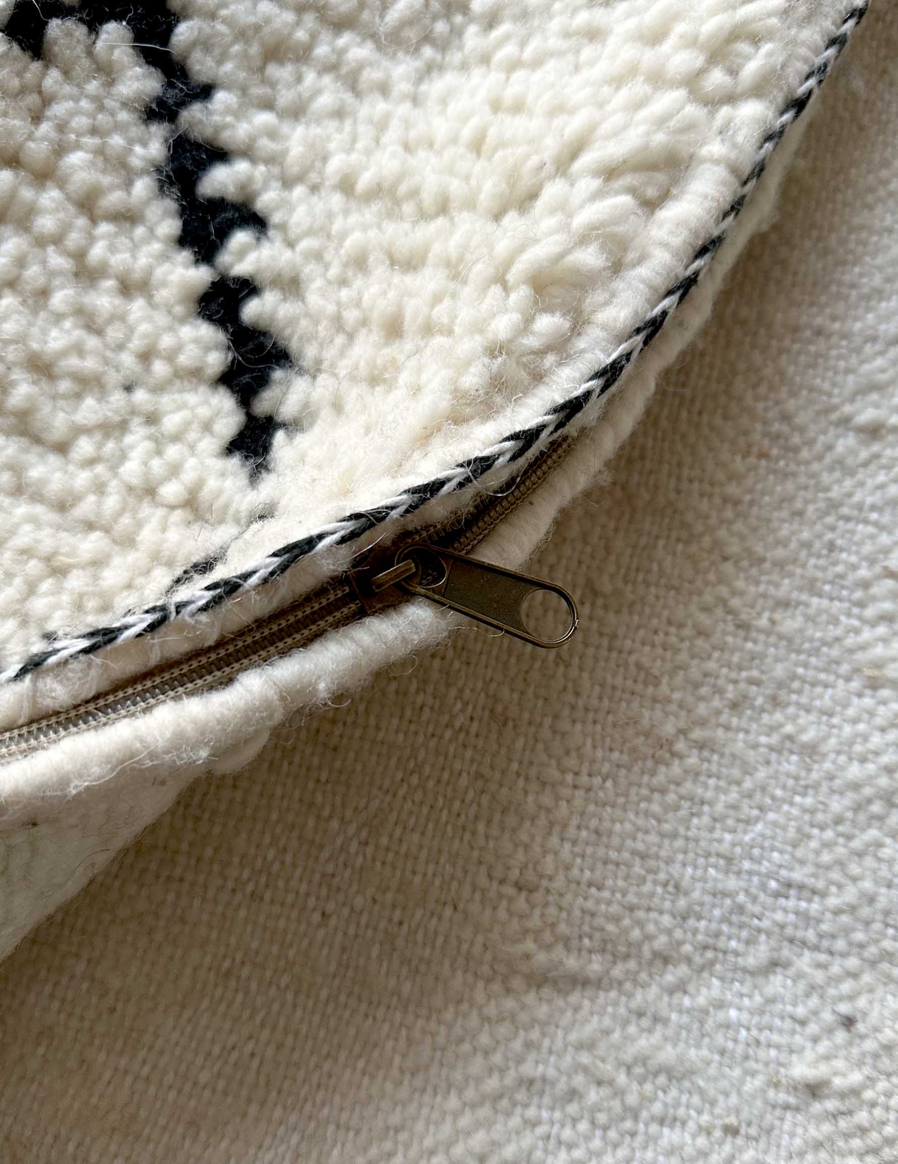 ベニワレンはモロッコのアトラス山脈に住むベルベル人女性によって、一目一目しっかりと結びながら織らているハンドメイドのウールラグです。白を基調とし黒の細いラインで模様が描かれています。触り心地はふわふわと柔らかく長い毛足が特徴です。