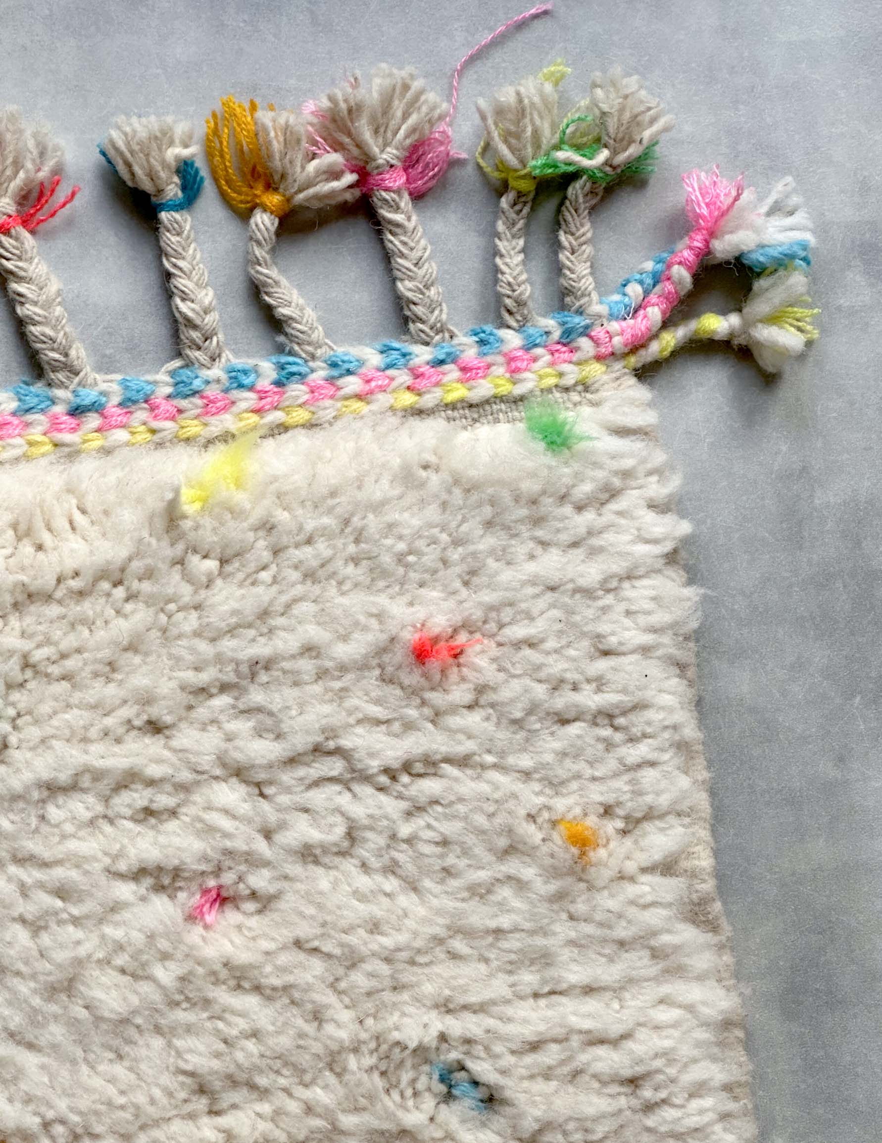 ・生産の性質上、ウールに他の色や植物の繊維が混じっている場合があります。検品の際に、除去できるものは取り除いていますが、手作業なので多少残っている場合がありますのでご了承ください。またピンセットを使うとラグを傷めずに取り除くことができます。