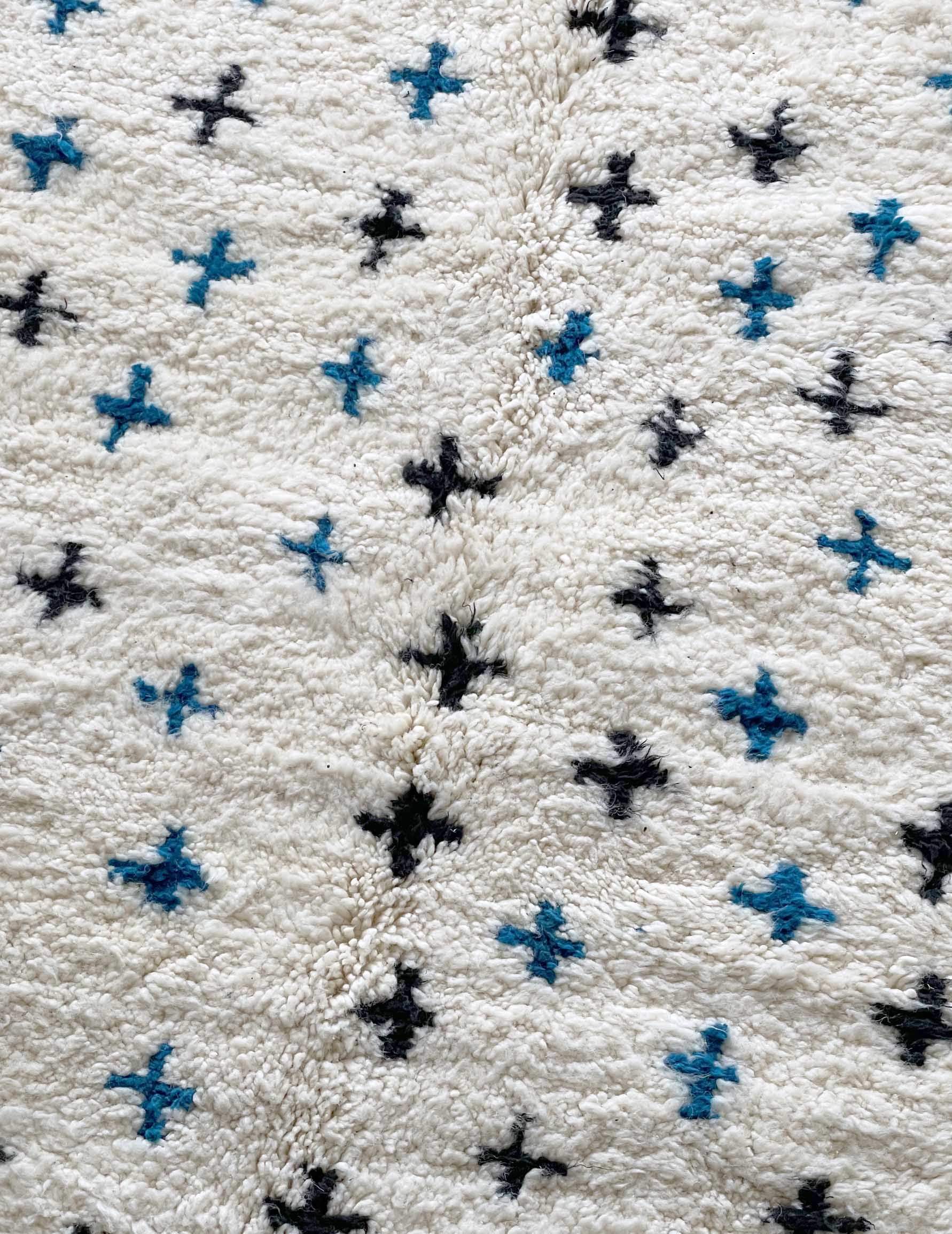 モロッコのアトラス山脈に住むベルベル人女性によって、一目一目しっかりと結びながら織らているハンドメイドのウールラグです。Zarabiyaのオリジナルデザインで、触り心地はふわふわと柔らかいです。シンプルなデザインとナチュラルな色合いは、コーディネートの幅も広く他のインテリアとも調和しやすいです。