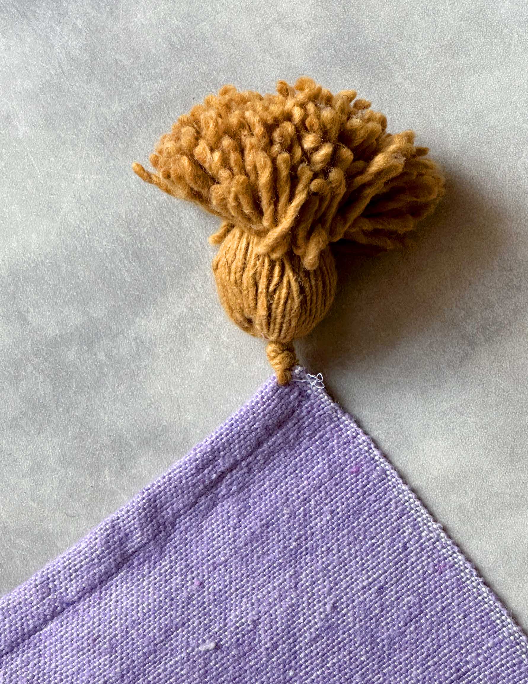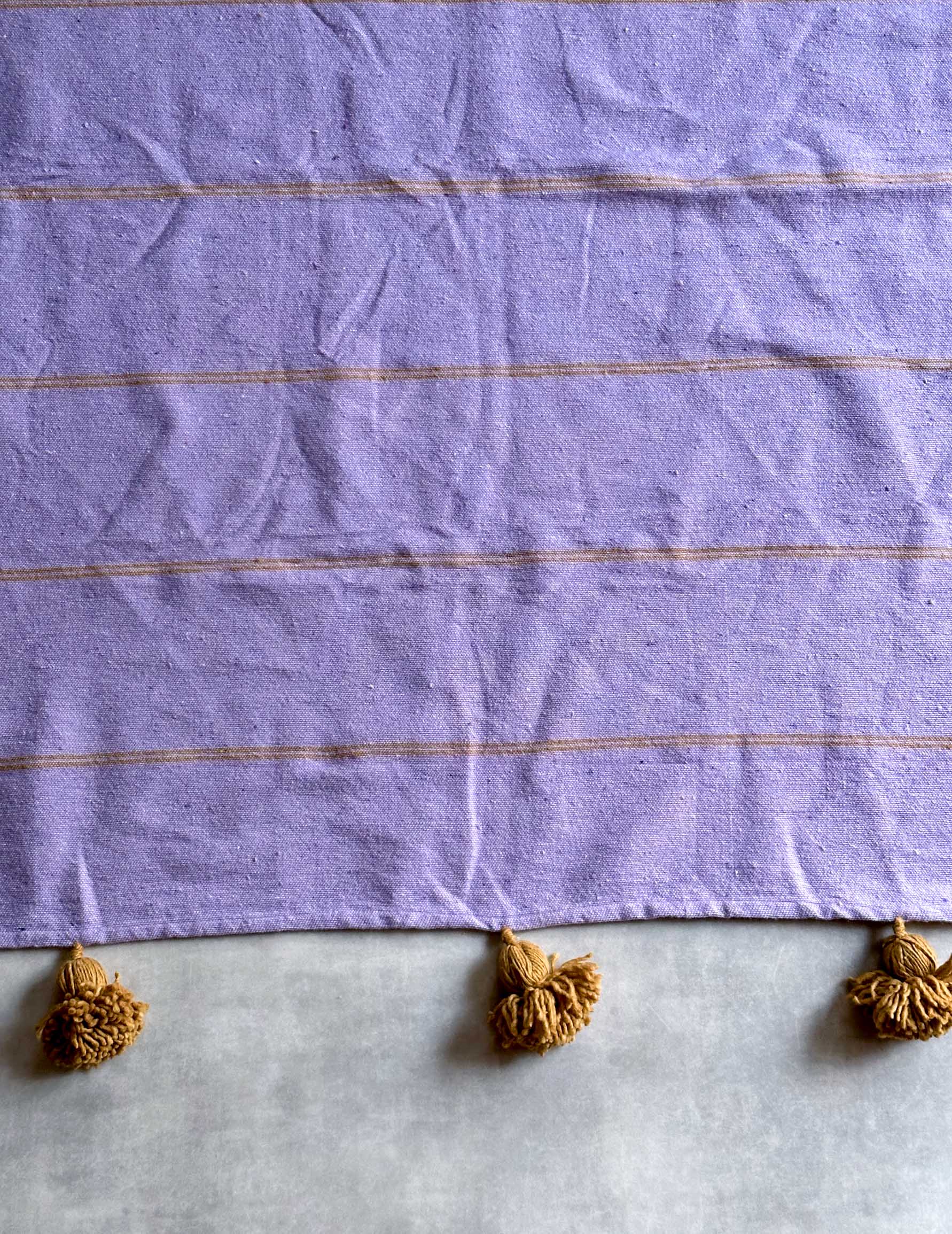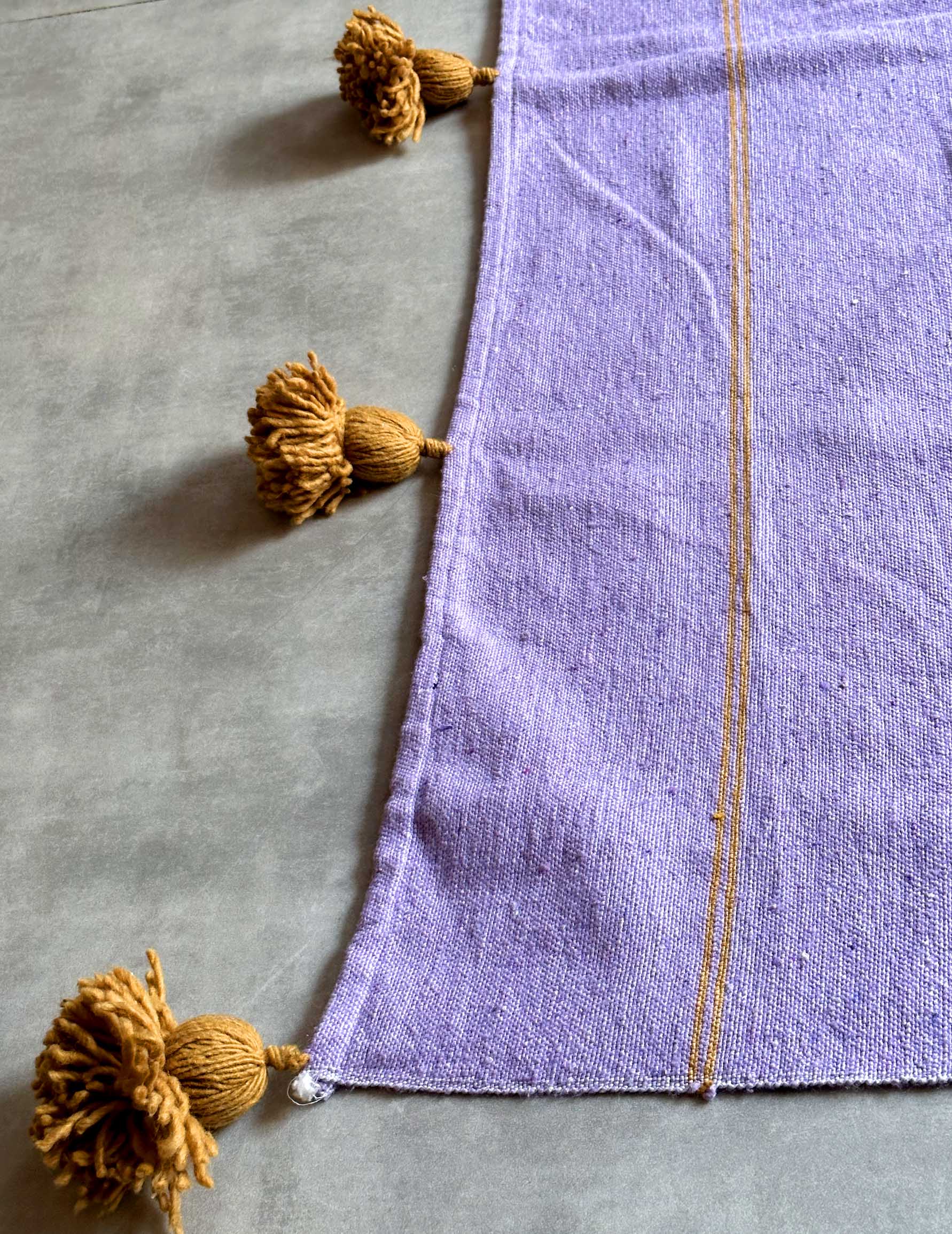 手織りで1枚1枚丁寧に織られた綿100%のブランケット。厚地でしっかりとした生地で、両端にポンポンがついています。