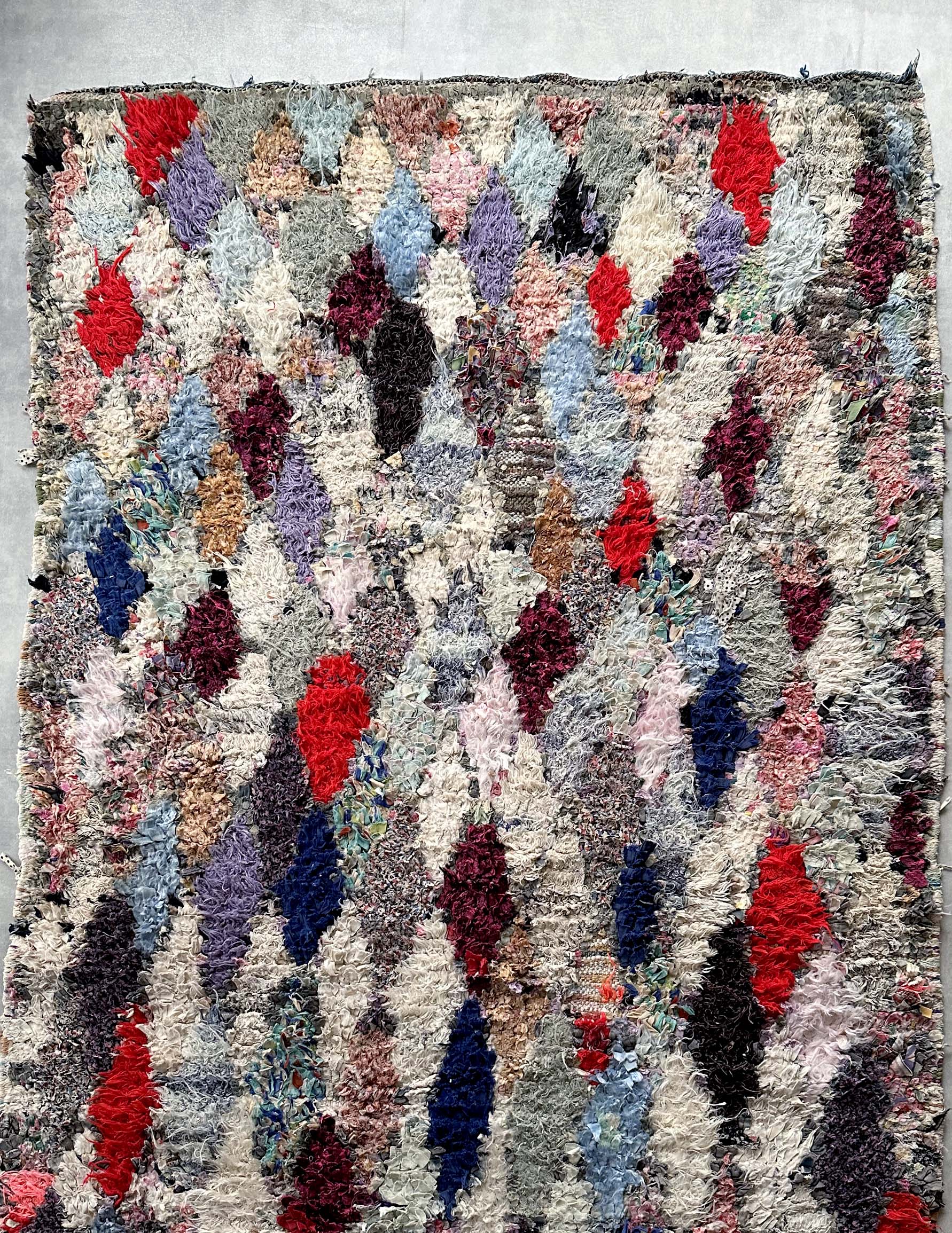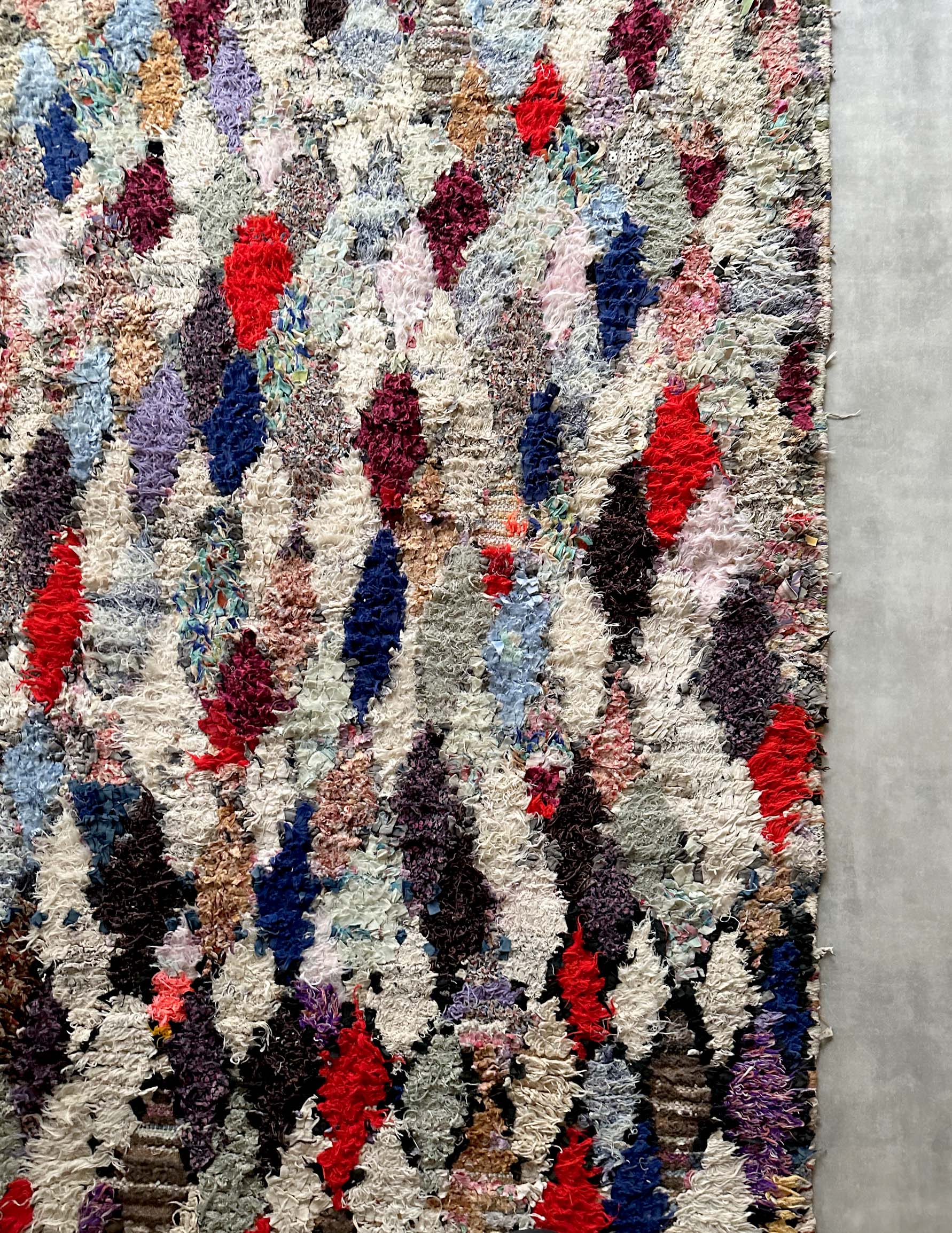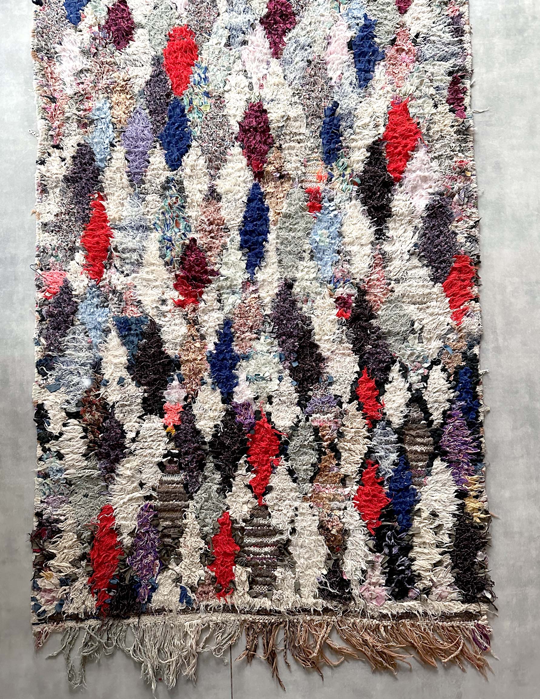 ボシャルウィットはアトラス山脈に住むベルベル人の女性が衣類などの生地を裂いて編み込んだリサイクルモロッカンラグです。全て異なった生地を使用している為、色味の配色や長短が様々で全て1点物となります。またモロッコではラグとして使用されるだけではなく、壁に飾りアートとしても生活に取り入れられています。