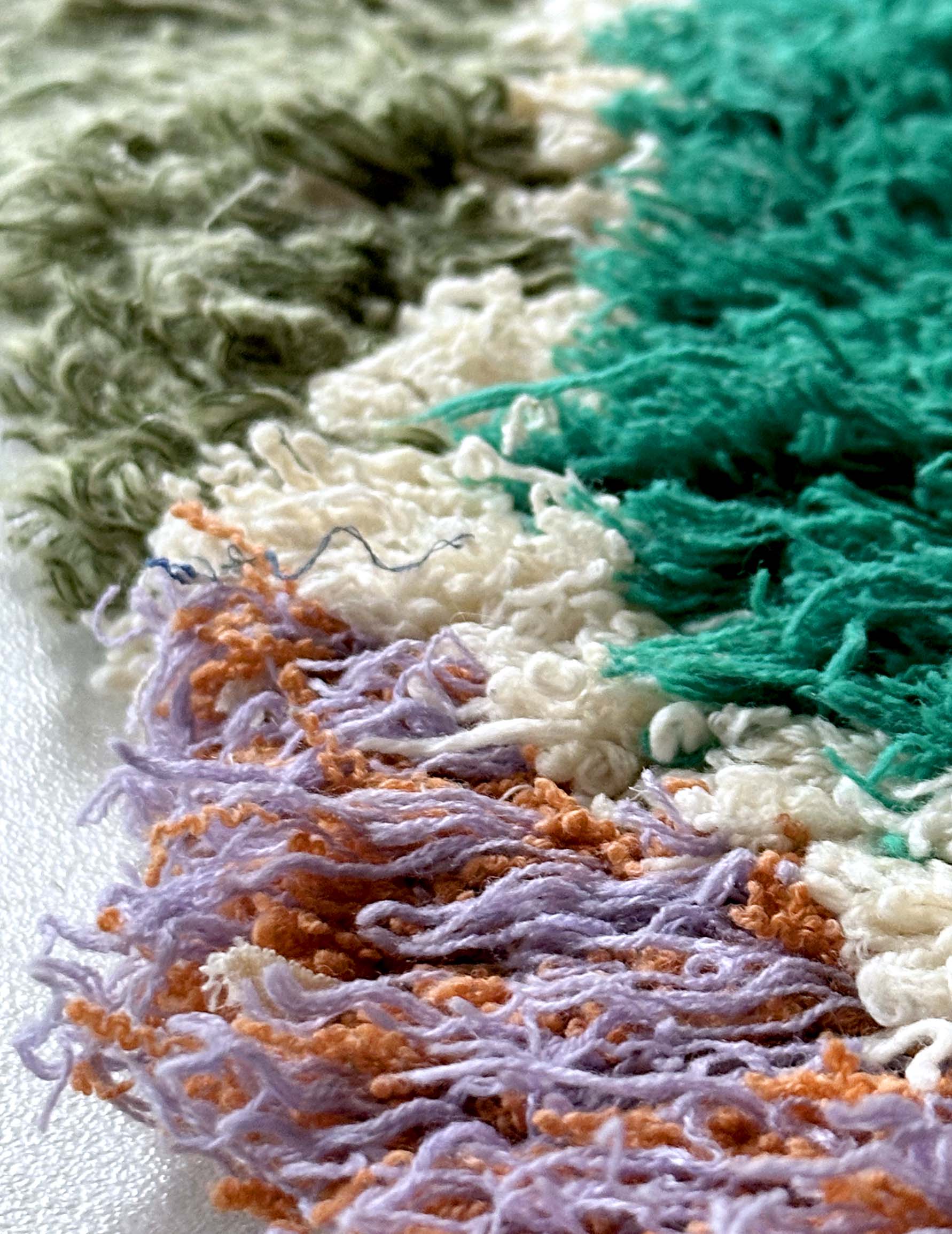 ボシャルウィットはアトラス山脈に住むベルベル人の女性が衣類などの生地を裂いて編み込んだリサイクルモロッカンラグです。全て異なった生地を使用している為、色味の配色や長短が様々で全て1点物となります。またモロッコではラグとして使用されるだけではなく、壁に飾りアートとしても生活に取り入れられています。