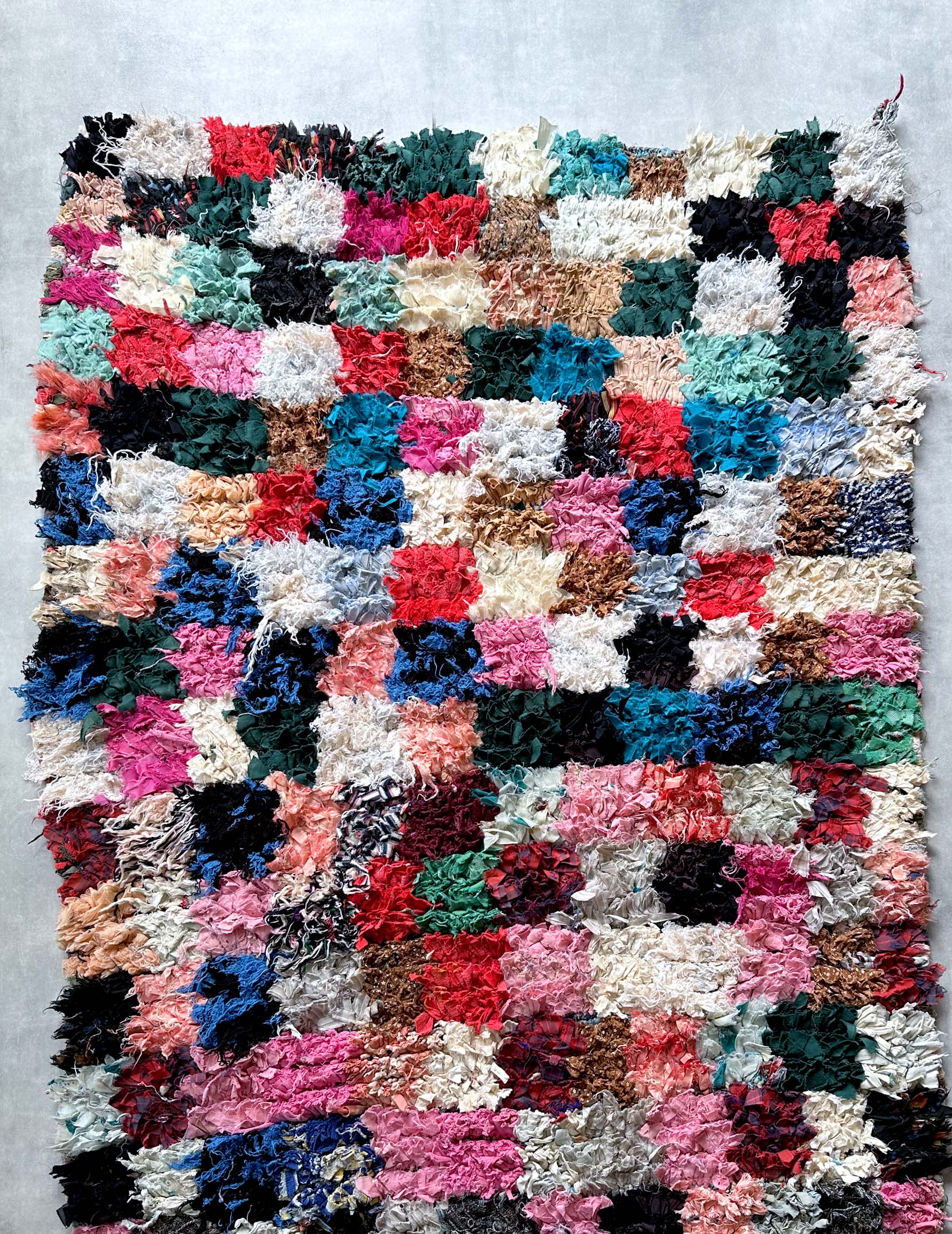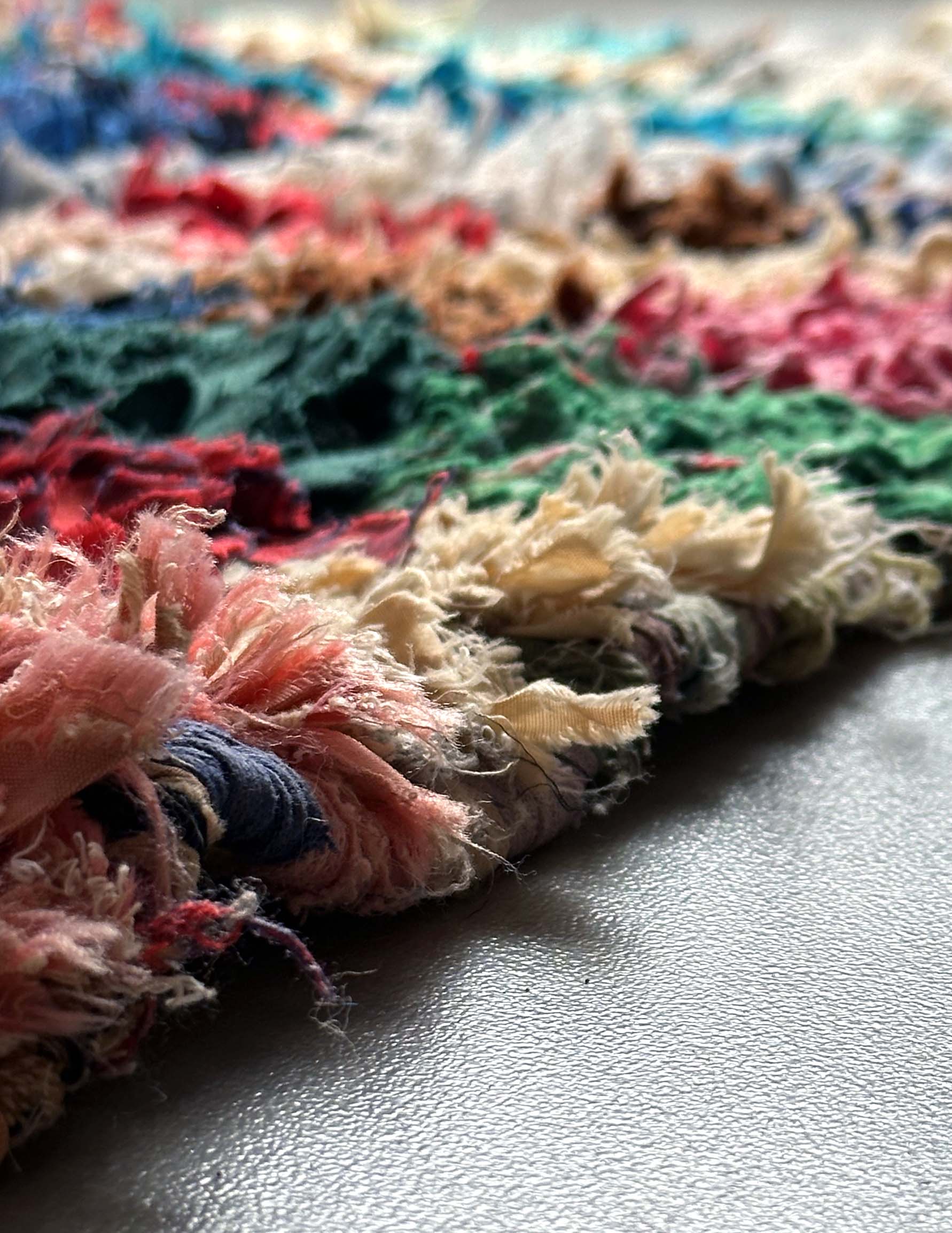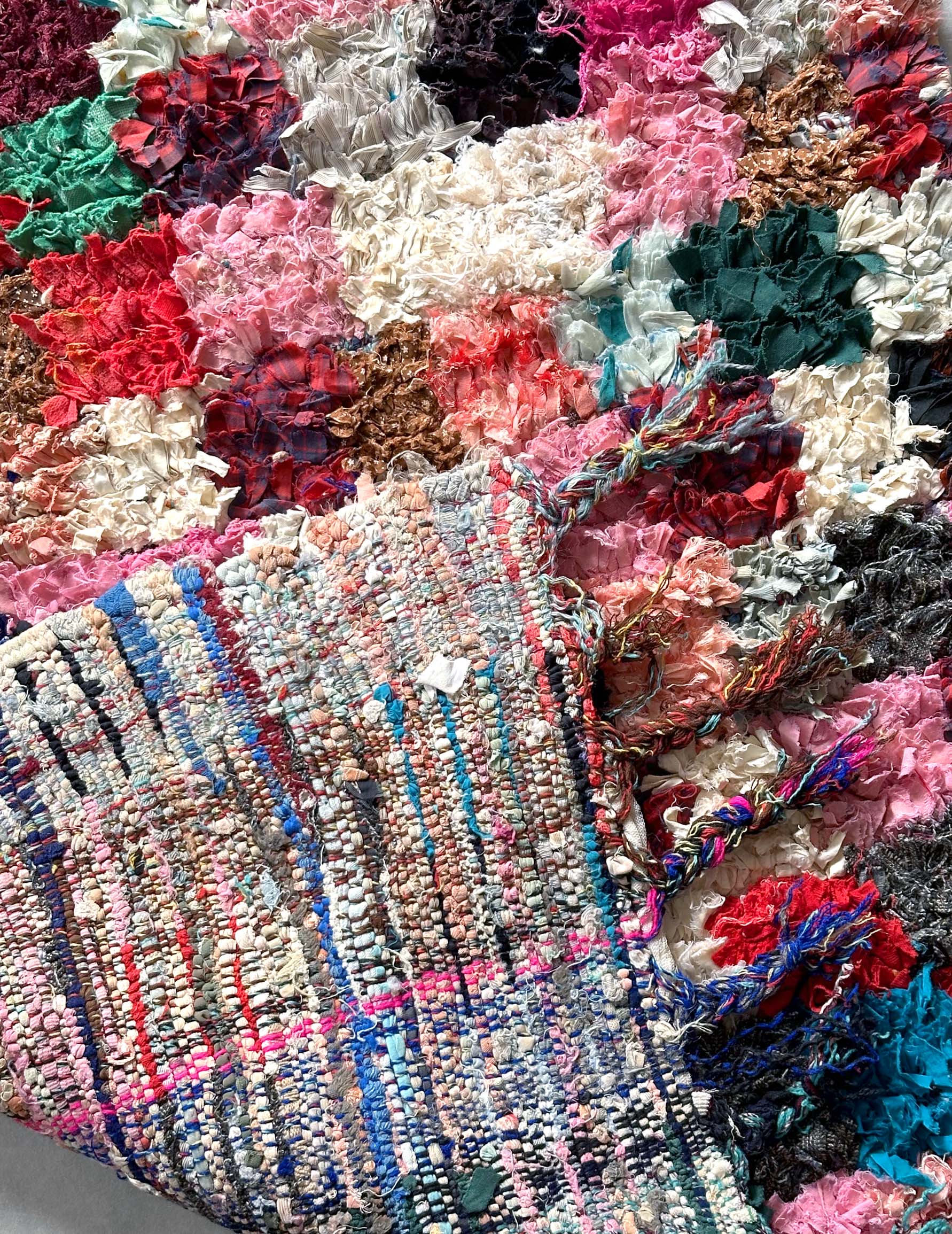 ボシャルウィットはアトラス山脈に住むベルベル人の女性が衣類などの生地を裂いて編み込んだリサイクルモロッカンラグです。全て異なった生地を使用している為、色味の配色や長短が様々で全て1点物となります。またモロッコではラグとして使用されるだけではなく、壁に飾りアートとしても生活に取り入れられています。