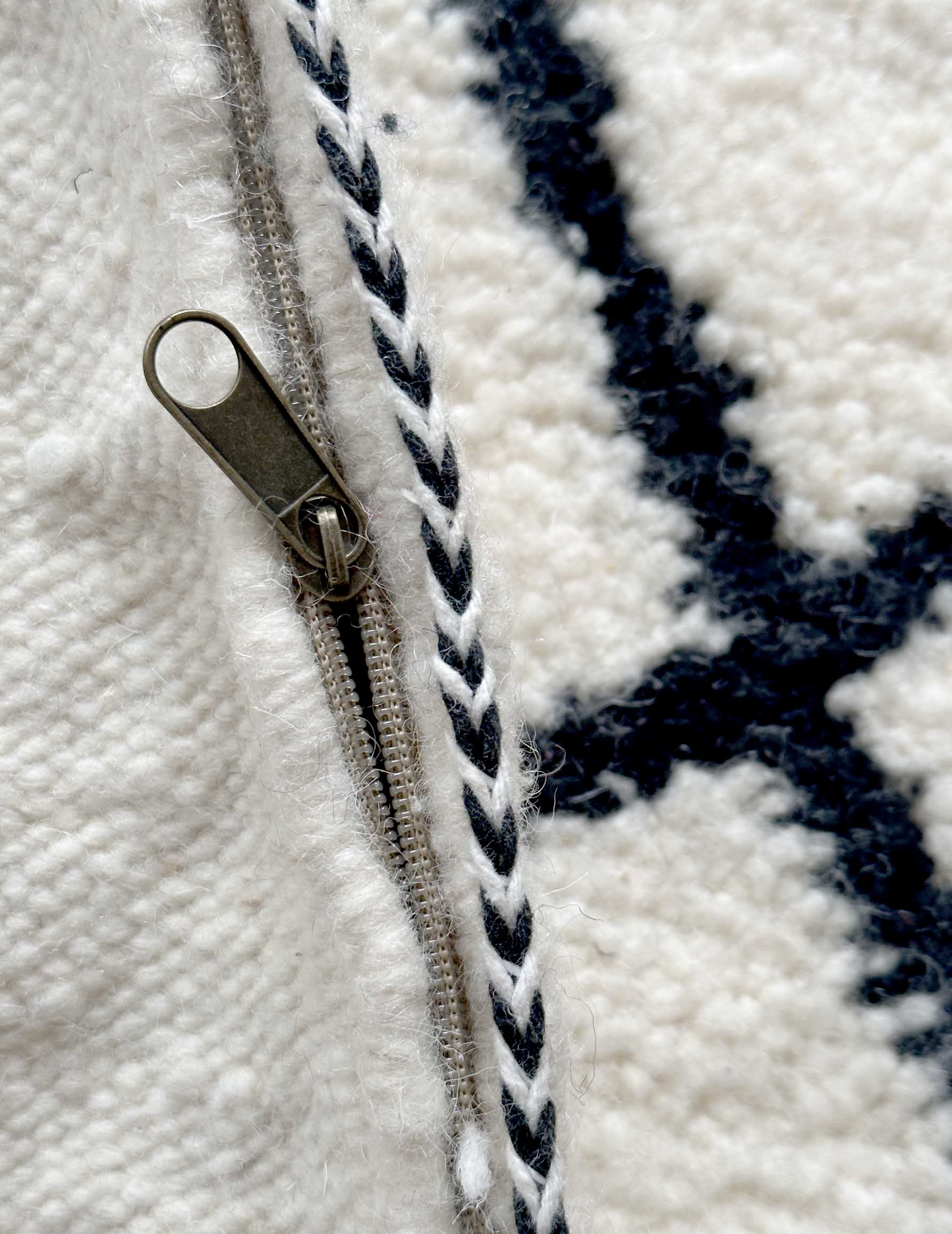 ベニワレンはモロッコのアトラス山脈に住むベルベル人女性によって、一目一目しっかりと結びながら織らているハンドメイドのウールラグです。白を基調とし黒の細いラインで模様が描かれています。触り心地はふわふわと柔らかく長い毛足が特徴です。
