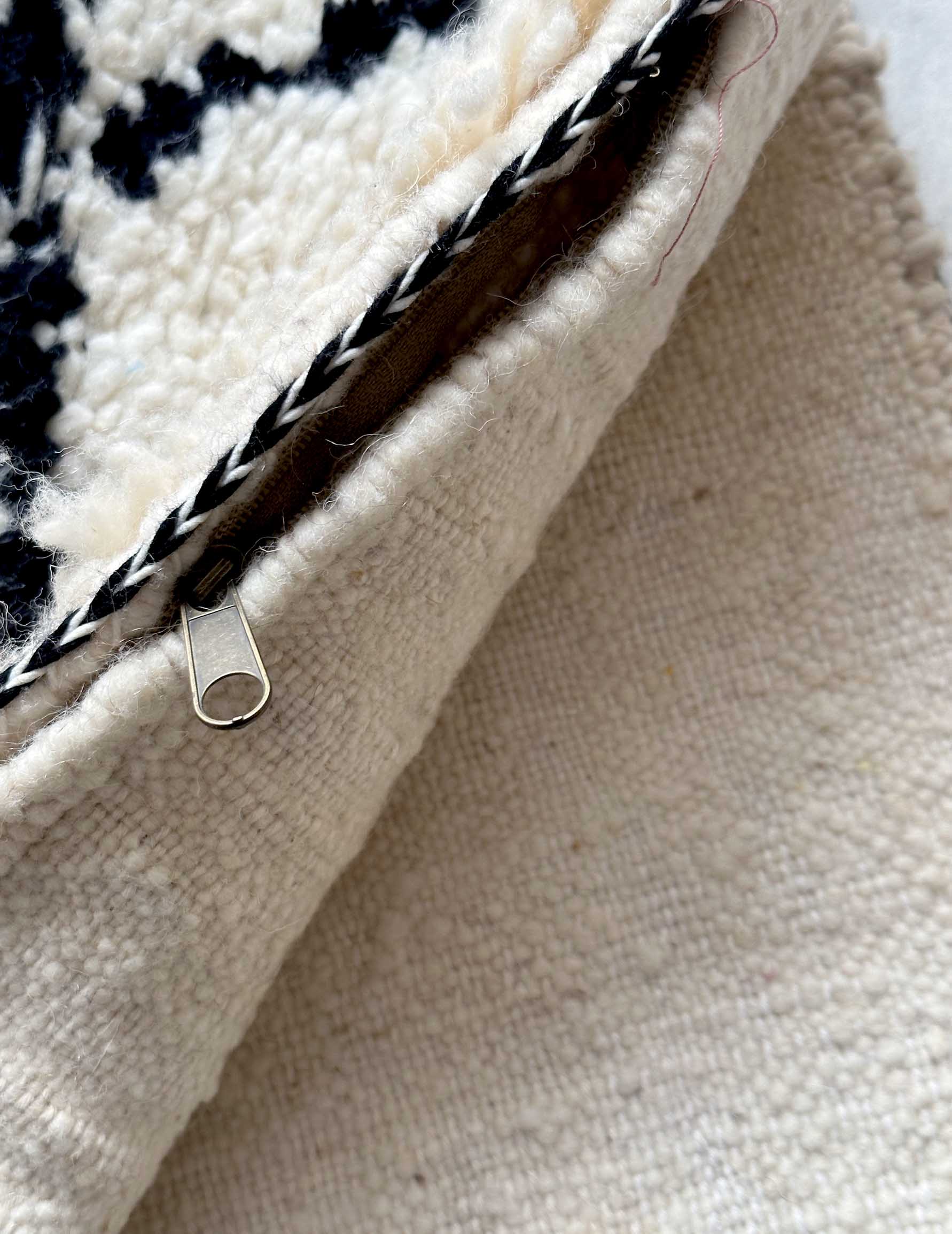 ベニワレンはモロッコのアトラス山脈に住むベルベル人女性によって、一目一目しっかりと結びながら織らているハンドメイドのウールラグです。白を基調とし黒の細いラインで模様が描かれています。触り心地はふわふわと柔らかく長い毛足が特徴です。