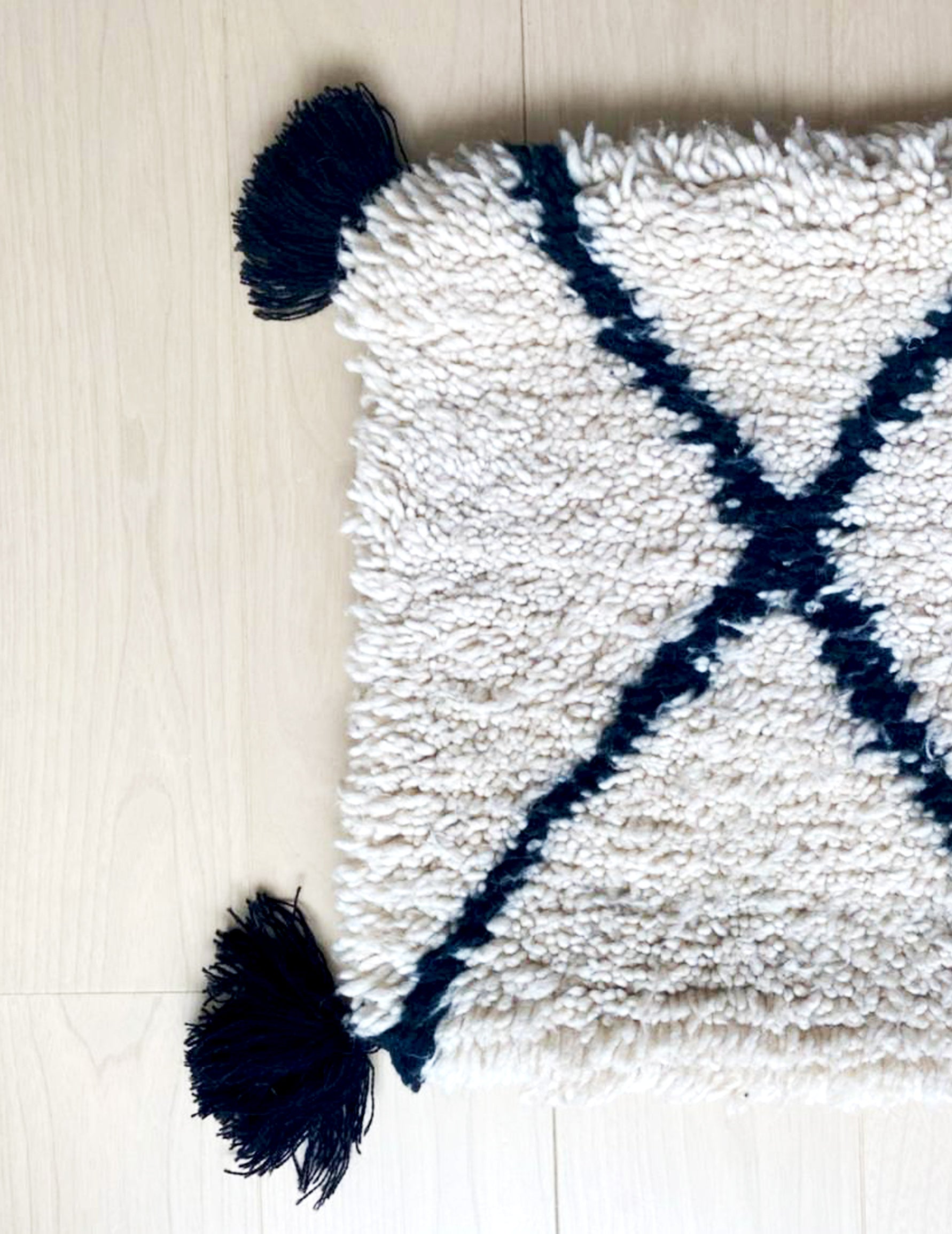 ベニワレンはモロッコのアトラス山脈に住むベルベル人女性によって、一目一目しっかりと結びながら織らているハンドメイドのウールラグです。白を基調とし黒の細いラインで模様が描かれています。触り心地はふわふわと柔らかく長い毛足が特徴です。