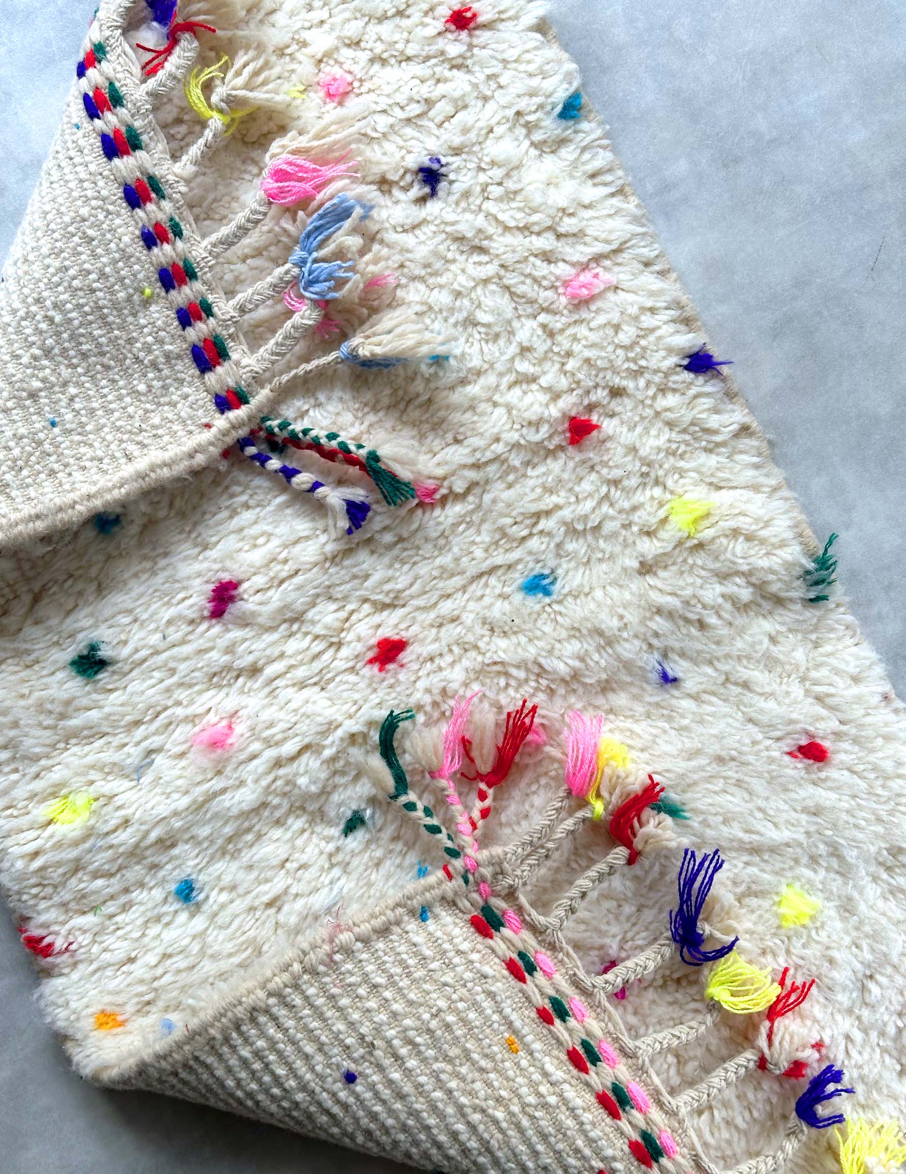 ・生産の性質上、ウールに他の色や植物の繊維が混じっている場合があります。検品の際に、除去できるものは取り除いていますが、手作業なので多少残っている場合がありますのでご了承ください。またピンセットを使うとラグを傷めずに取り除くことができます。