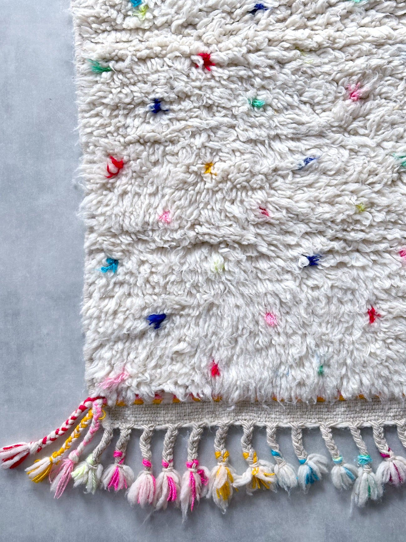 モロッコ・アトラス山脈に古くから住むベルベル人女性が、伝統的な手法を受け継ぎながら上質なウールで一枚ずつ丁寧に手織りしたラグです。カラフルなドット模様と鮮やかなサイドフリンジが、どの空間もぱっと明るく楽しい雰囲気に変えてくれます。