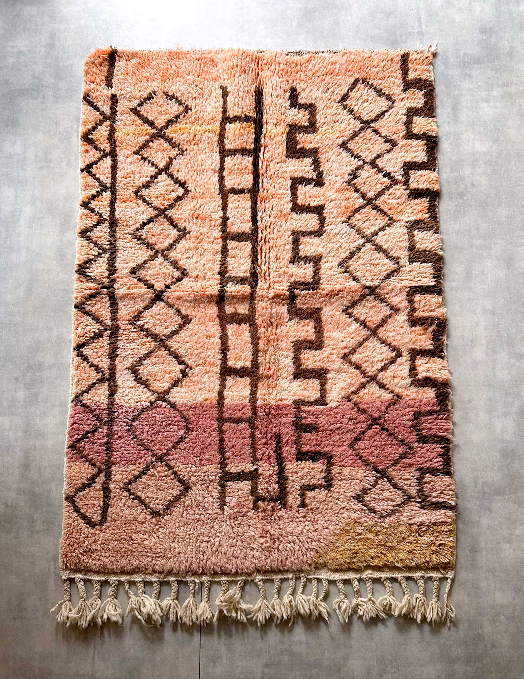 モロッコのアトラス山脈に住むベルベル人女性によって、一目一目しっかりと結びながら織らているハンドメイドのウールラグです。
