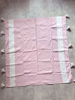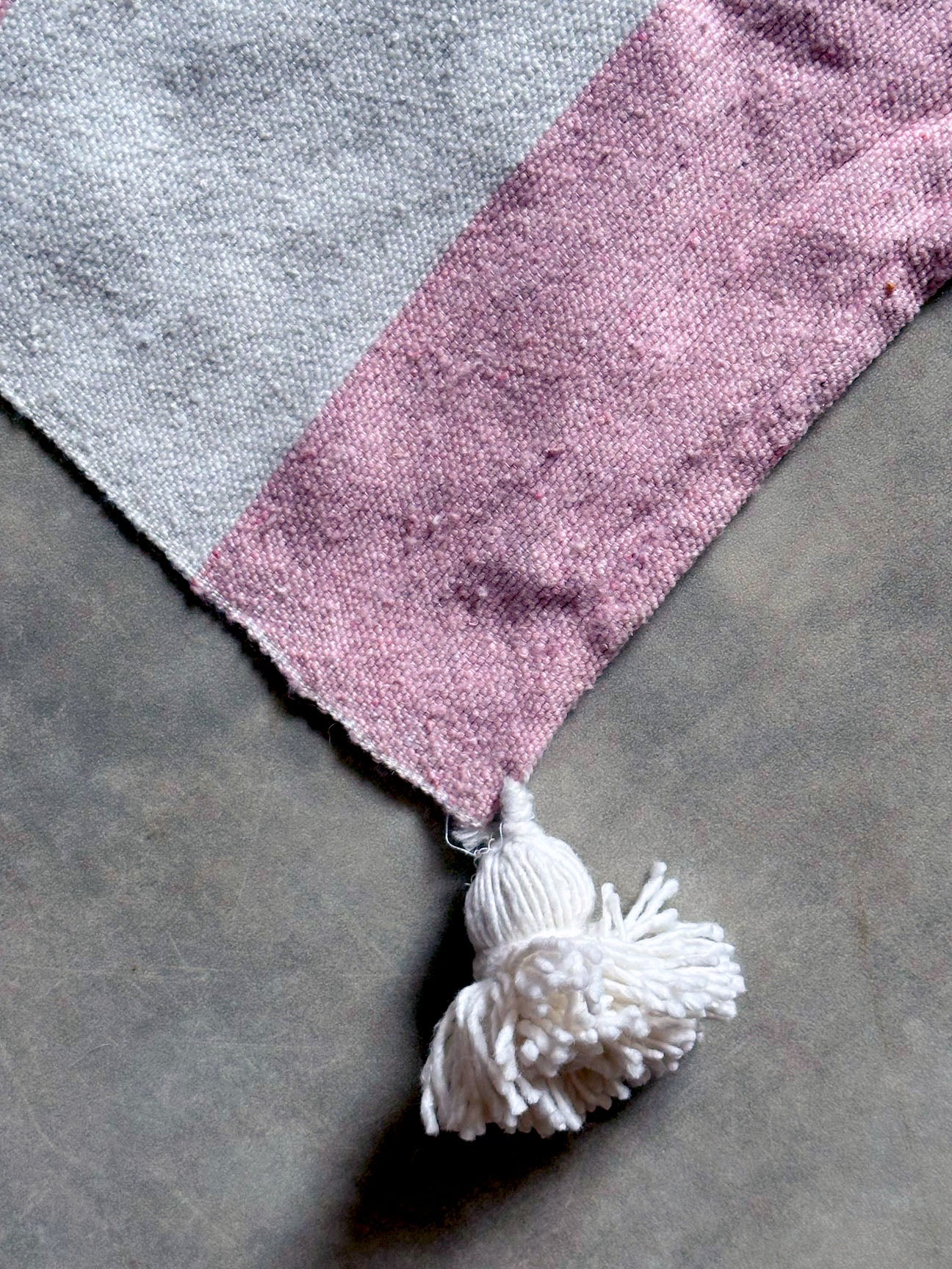 手織りで1枚1枚丁寧に織られた綿100%のブランケット。厚地でしっかりとした生地で、両端にポンポンがついています。