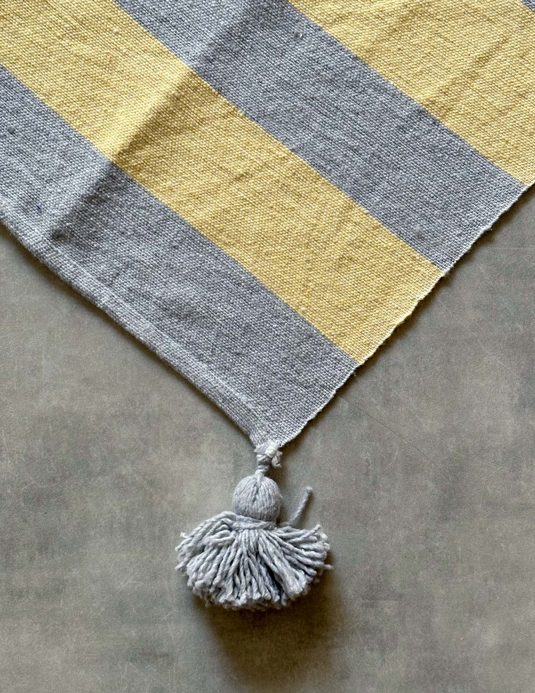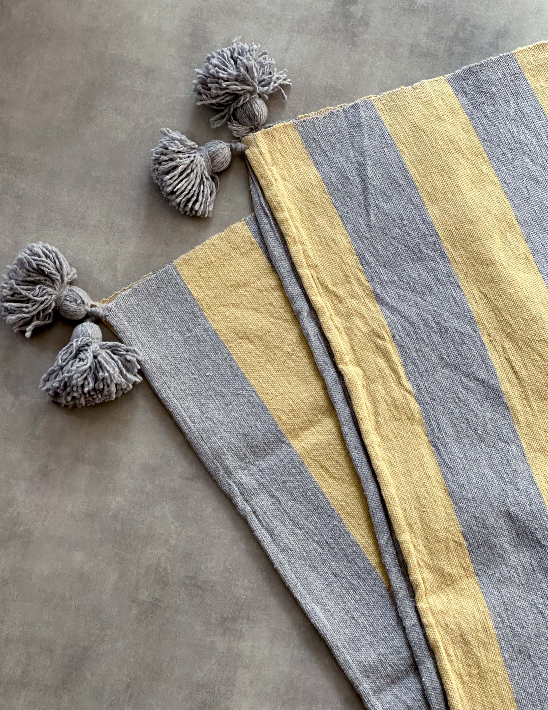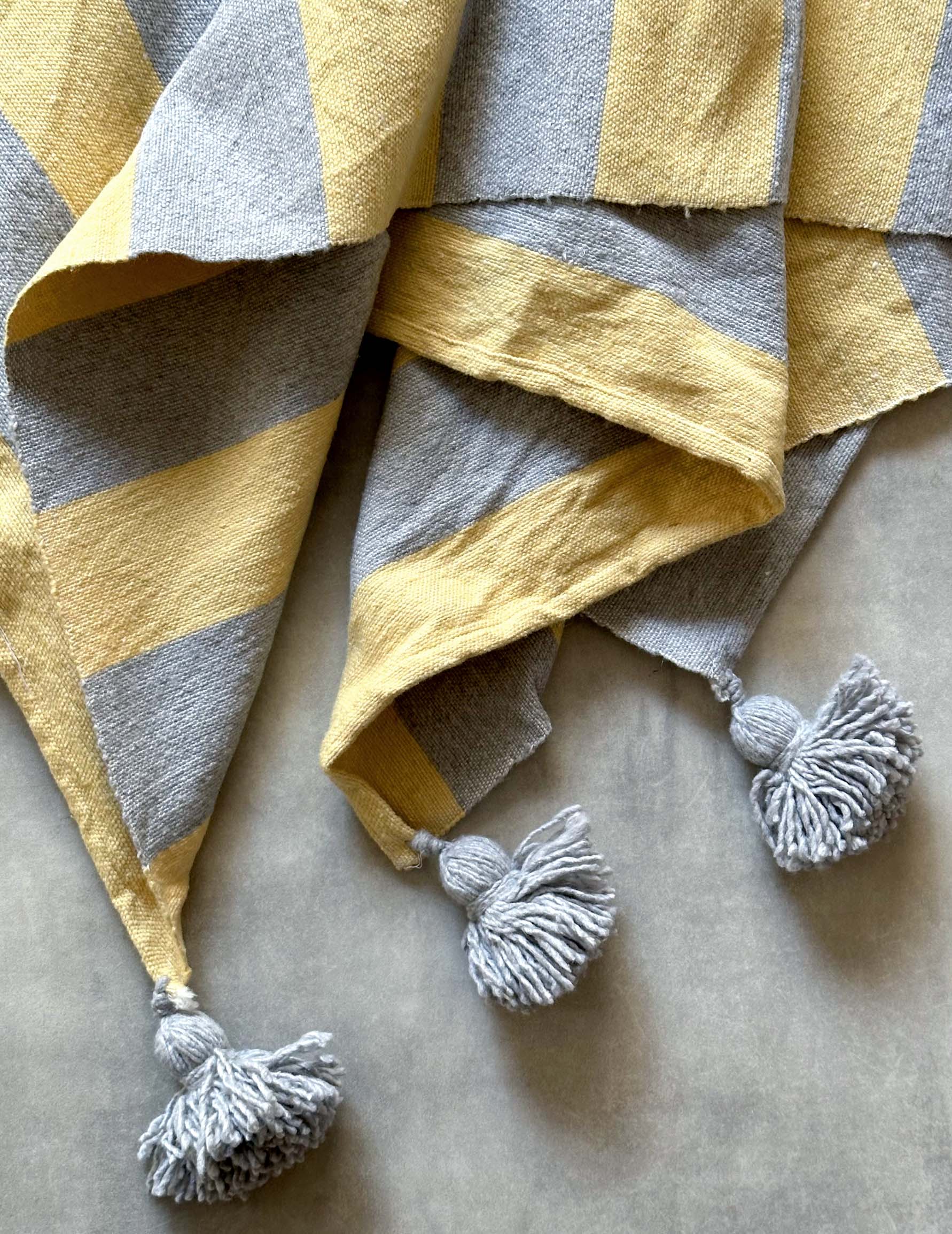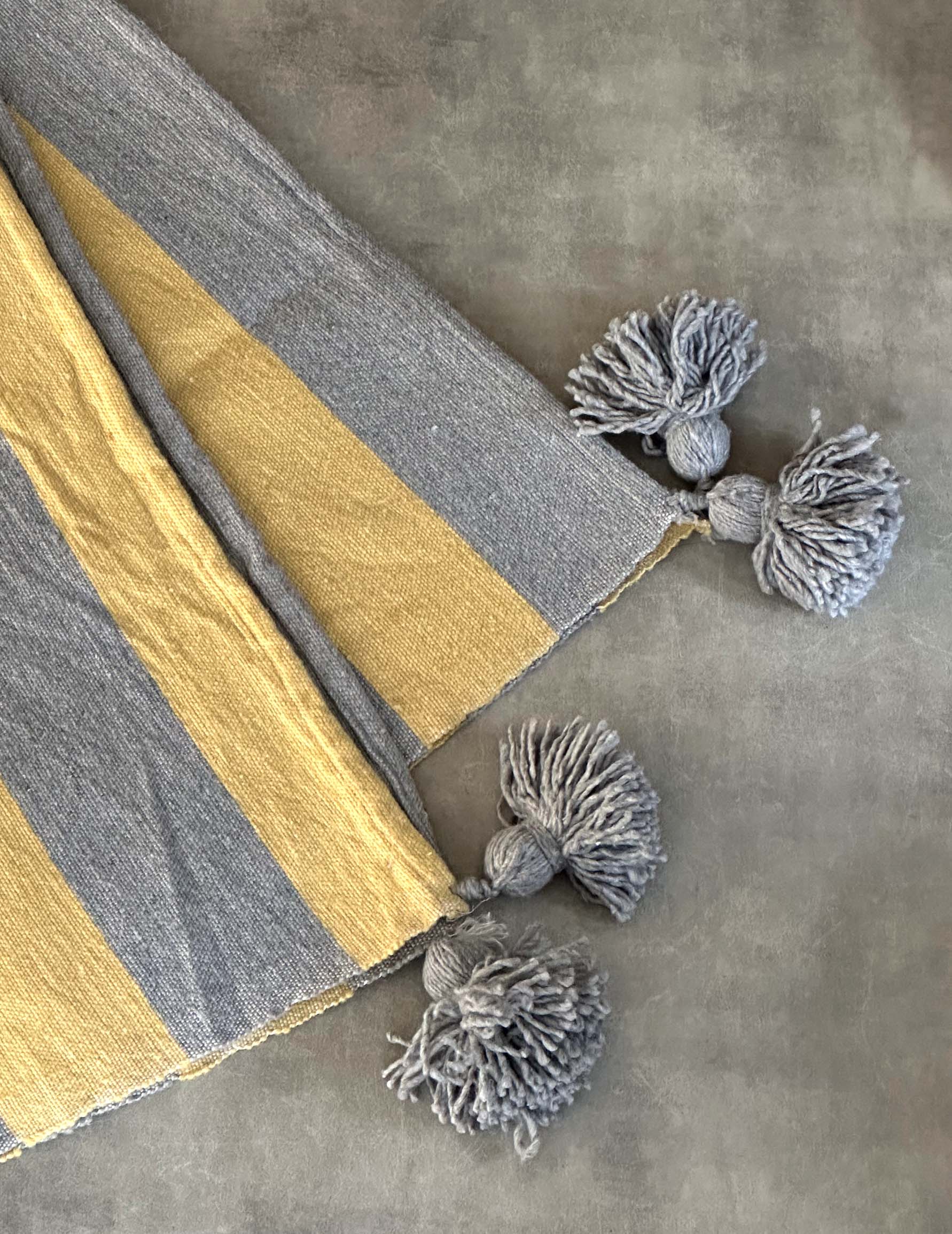 手織りで1枚1枚丁寧に織られた綿100%のブランケット。厚地でしっかりとした生地で、両端にポンポンがついています。