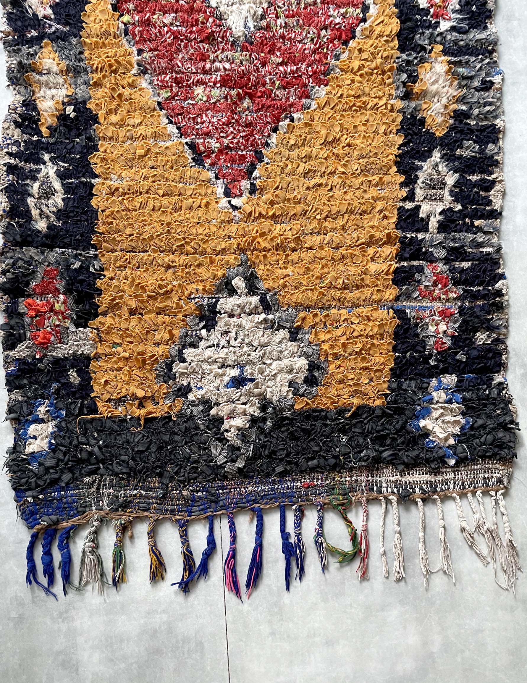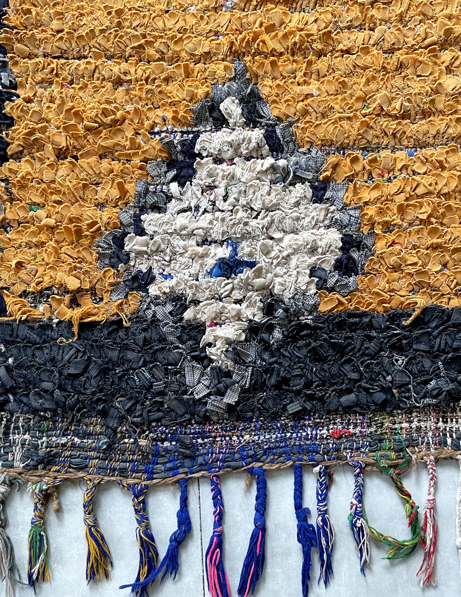 ボシャルウィットはアトラス山脈に住むベルベル人の女性が衣類などの生地を裂いて編み込んだリサイクルモロッカンラグです。全て異なった生地を使用している為、色味の配色や長短が様々で全て1点物となります。またモロッコではラグとして使用されるだけではなく、壁に飾りアートとしても生活に取り入れられています。