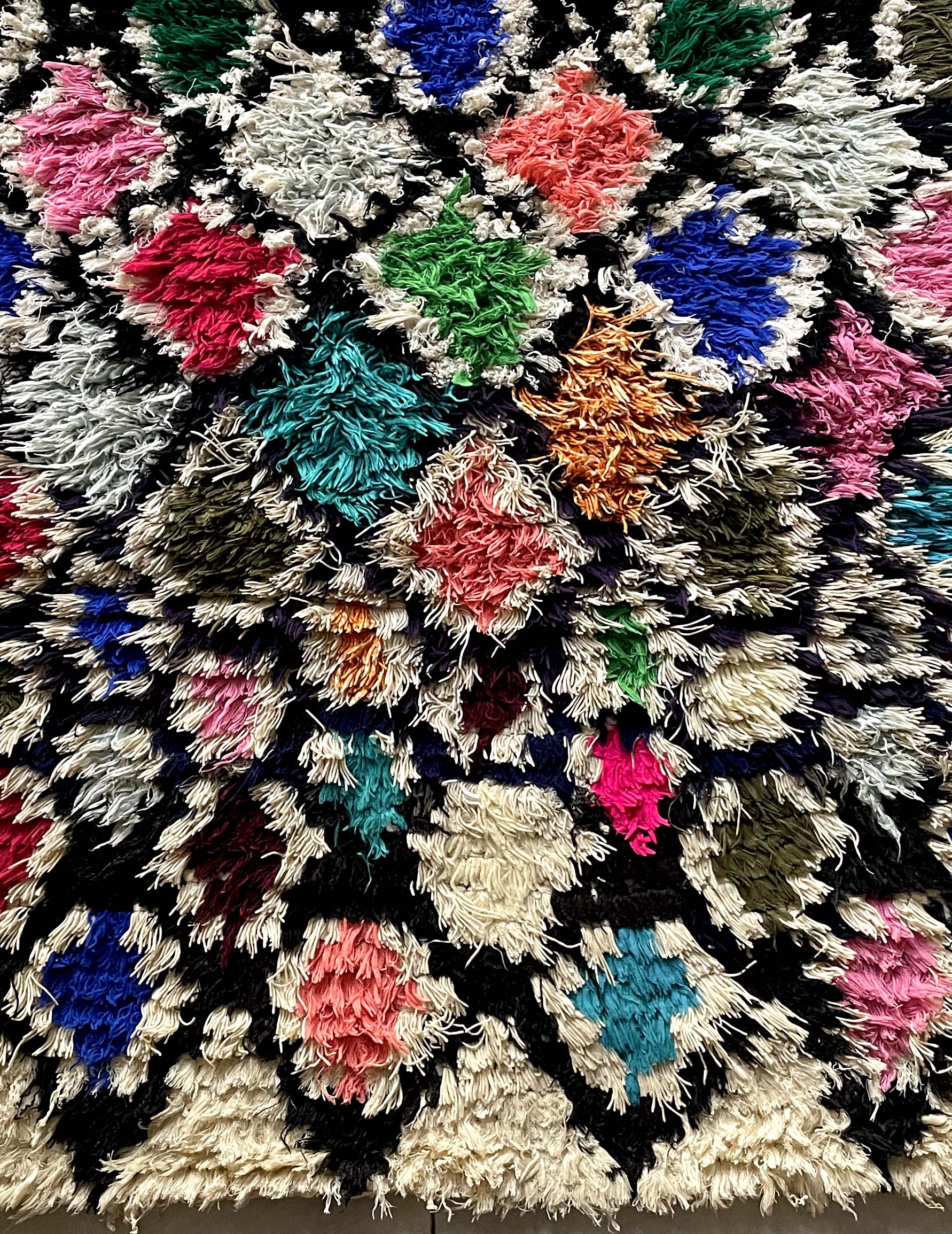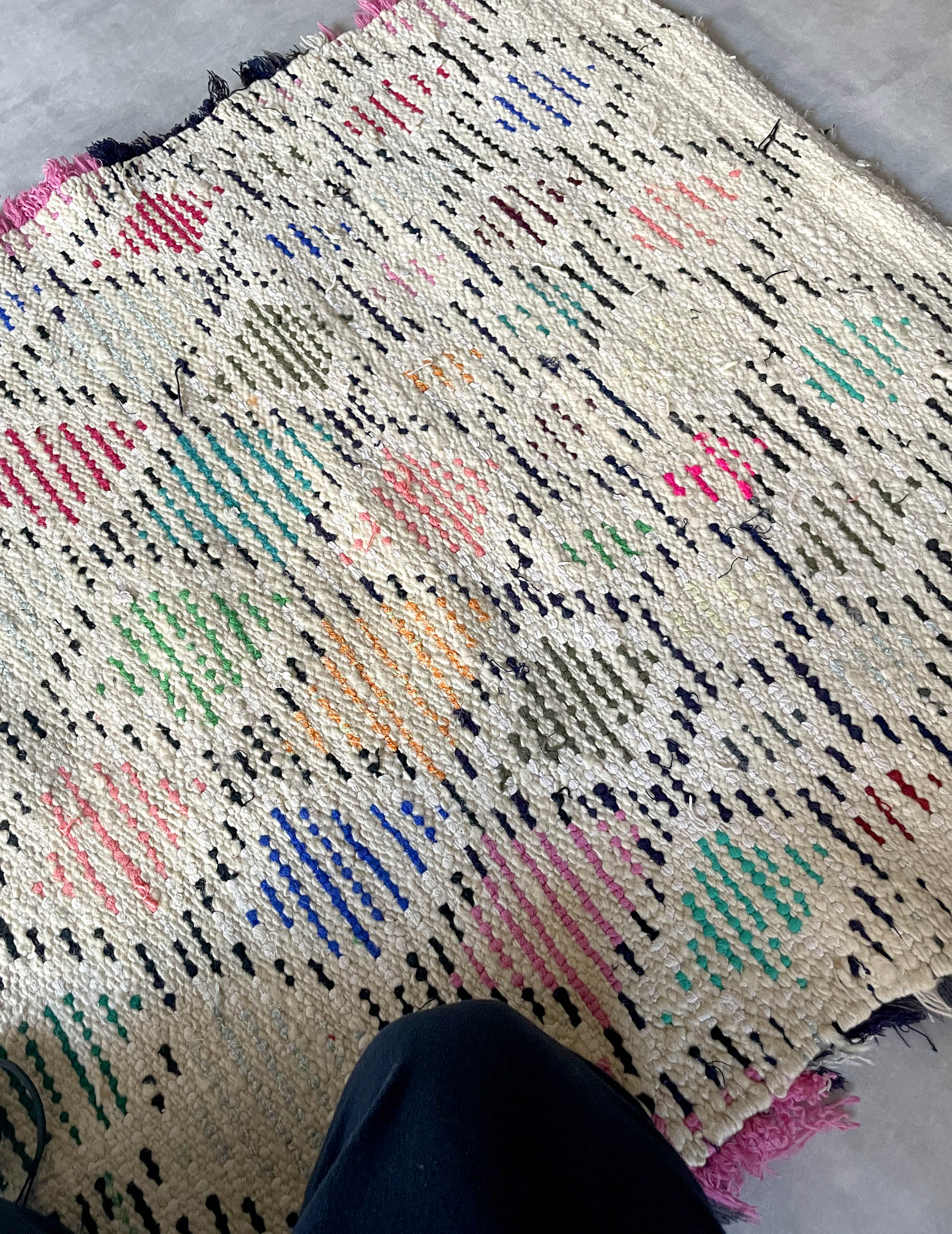 ボシャルウィットはアトラス山脈に住むベルベル人の女性が衣類などの生地を裂いて編み込んだリサイクルモロッカンラグです。全て異なった生地を使用している為、色味の配色や長短が様々で全て1点物となります。またモロッコではラグとして使用されるだけではなく、壁に飾りアートとしても生活に取り入れられています。
