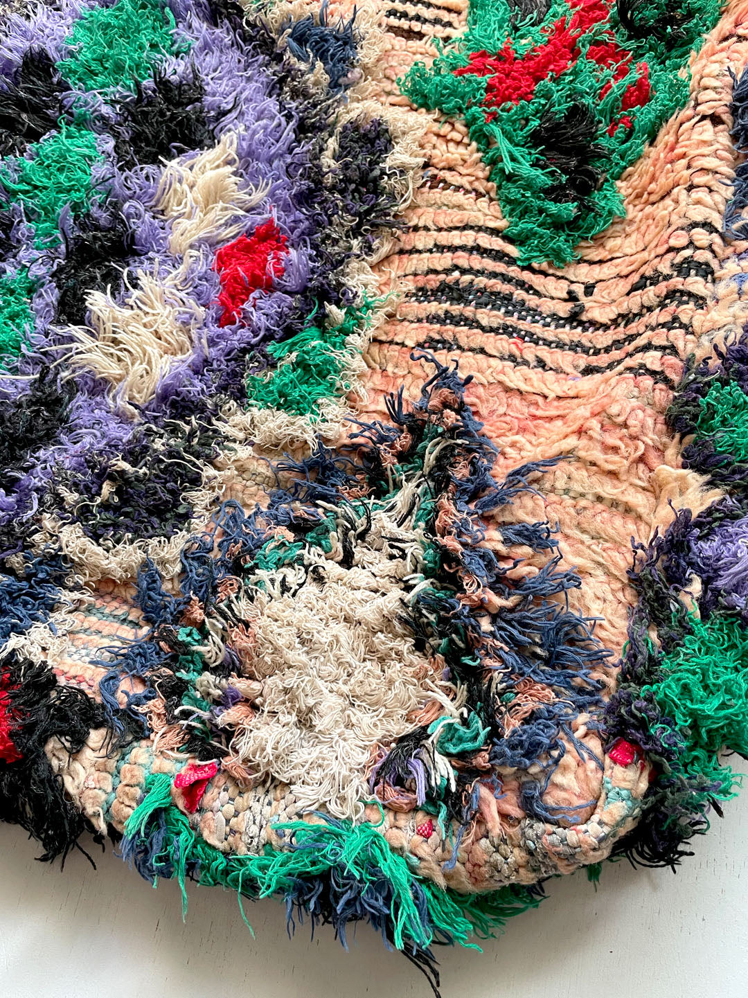 ブジャドプフはモロッコのアトラス山脈に住む、ベルベル人女性によって編まれた毛の短いウールラグを使用し作られたプフとなります。
